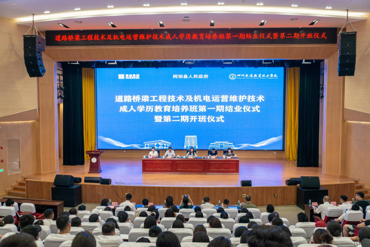 由蜀道投资集团有限责任公司、阿坝县人民政府、四川交通职业技术学院举办的道路桥梁工程技术及机电运营维护技术成人学历教育培养班第一期结业仪式暨第二期开班仪式于5月19日上午在学院厚学楼报告厅举行。蜀道集团党委委员、职工董事、工会主席朱莉,阿坝县人民政府副县长李玉玺,学院党委书记冯书明等相关领导出席了该活动,活动由学院党委委员、副院长刘玉荣主持。