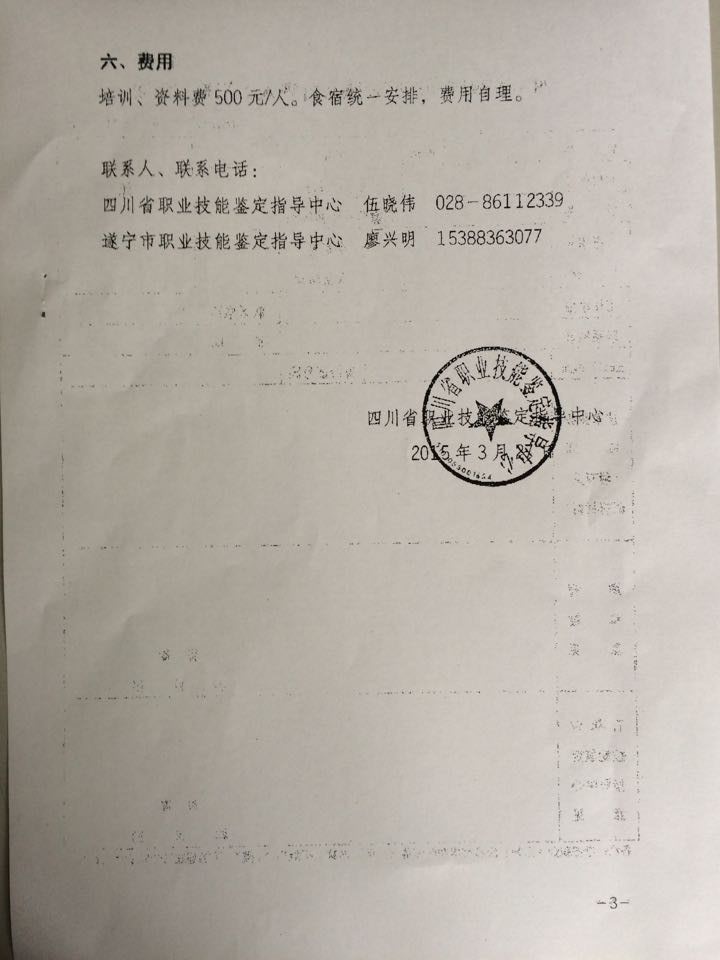 根据四川省职业技能鉴定指导中心《四川省职业技能鉴定指导中心关于举办全省职业技能鉴定考评员培训班的通知》川人社职鉴(2015)6号文件要求,结合学院鉴定所(川-012)工作安排,定于2015年4月8日至4月10日组织相关系部教师赴遂宁参加全省职业技能鉴定考评员培训班。